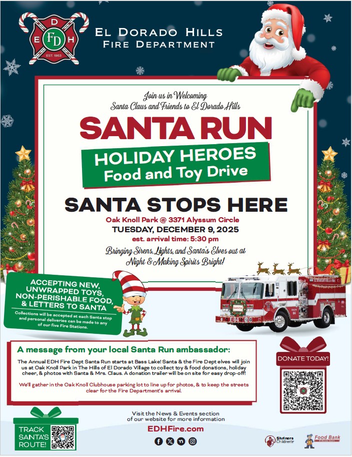 Get ready for a spectacular start to the holiday season! The El Dorado Hills Fire Department is kicking off its annual SANTA RUN and HOLIDAY HEROES Food and Toy Drive, and the first stop is right here at Oak Knoll Park!